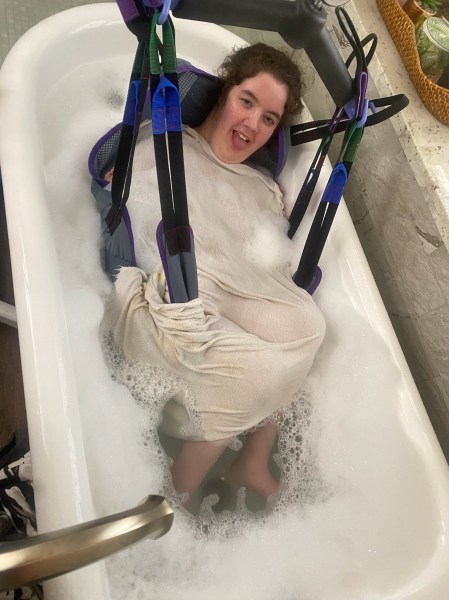 But today, I found a little slice of comfort. I took the best bubble bath. My parents have this beautiful, old-fashioned tub that sits up off the ground, and we discovered that it’s the perfect height for my Hoyer lift to slide underneath. That wasn’t planned—it just happened to work out that way!
